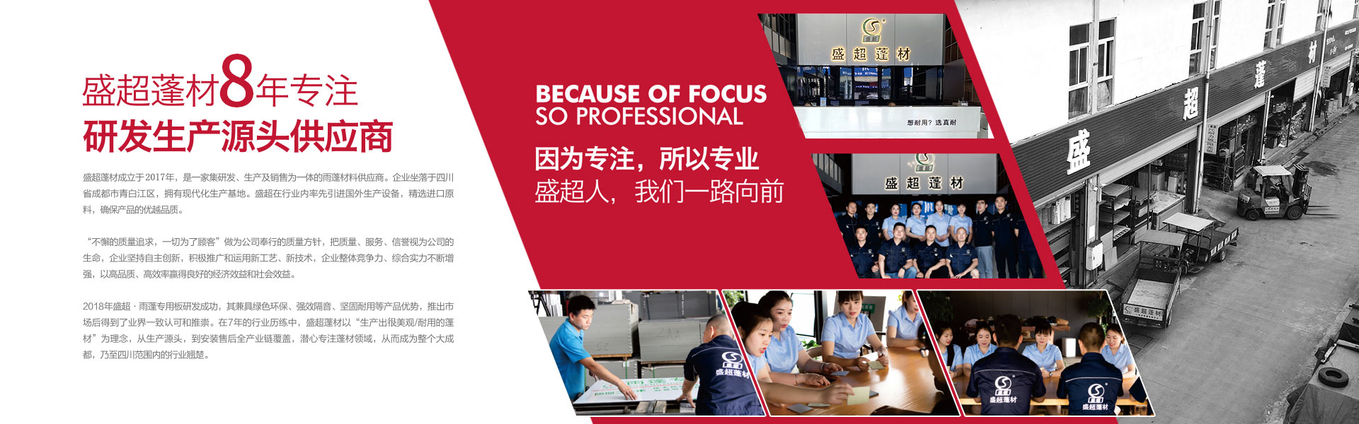 盛超蓬材是由四川超諾商貿(mào)有限公司創(chuàng)辦,是一家集研發(fā)、生產(chǎn)、銷(xiāo)售和服務(wù)于一體的專(zhuān)業(yè)雨蓬供應(yīng)商。主要產(chǎn)品:實(shí)心耐力板,中空陽(yáng)光板、多層板、蜂窩板、鋁瓦、消聲鋁瓦、不銹鋼消聲等材料的雨蓬產(chǎn)品。自主研發(fā)多款雨蓬,擁有自己的專(zhuān)利和檢測(cè)報(bào)告。其中明星產(chǎn)品新型組裝式雨蓬,擁有組裝簡(jiǎn)便,美觀(guān)耐用、抗噪音,性?xún)r(jià)比高等優(yōu)勢(shì),多項(xiàng)檢測(cè)指標(biāo)領(lǐng)跑同行業(yè)。受到了市場(chǎng)和經(jīng)銷(xiāo)商的高度認(rèn)可。 公司自成立至今,從銷(xiāo)售到研發(fā)再到生產(chǎn),已經(jīng)過(guò)了3次跨越式的發(fā)展。2017年已成為四川雨蓬行業(yè)內(nèi)庫(kù)房面積大,員工多的一家公司。產(chǎn)值每年以平均20%的速度快速增長(zhǎng)??梢哉f(shuō)客戶(hù)是我們的老師,和他們合作使我們得到很多的學(xué)習(xí)機(jī)會(huì)來(lái)提高自身的技術(shù)水平和管理水平,是我們生產(chǎn)和發(fā)展的動(dòng)力。